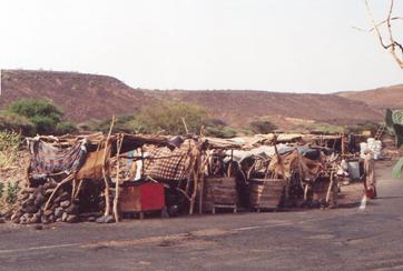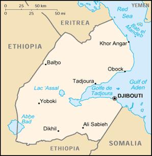 en het land heeft totaal geen landbouw cultuur, enkel woestijn. Het heetste plekje van Afrika ligt in Djibouti: Lac Assal, een zoutmeer waar het tegen de 60 graden Celsius is. Dit gebied is gevormd door vulkanische activiteit en botsing en verzakking van de continenten. Er zijn 2 volksstammen: Afars en Issas en het zijn voornamelijk vissers of nomaden die wat geiten hoeden en in tentjes wonen of onder een boom en een cirkeltje van stenen wonen. Tegenwoordig is men iets moderner en zie je ook stenen huisjes met golfplaat en autobanden als dak. Ook zie je in de steden oude koloniale huizen van de Franse overheersers van vroeger. Het land wordt nog steeds beschermd door Frankrijk: er zijn permanent 2800 Franse Legionairs gestationeerd op dit strategische punt midden in een onrustige regio. Tegenwoordig zitten er ook Amerikanen die de regio controleren. |