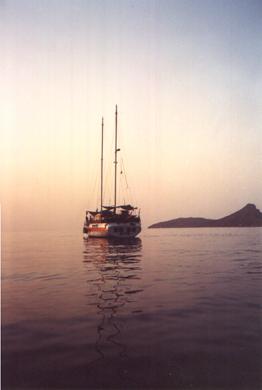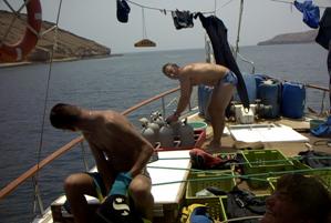 ![]() Rob en Martijn bereiden zich voor op een duik. Op het voordek was het soms behelpen, en mijn god, wat heb ik mijn kop vaak gestoten tegen de mast! | ![]() Op het achterdek was het in de schaduw prima uit te houden, en ’s avonds sliepen we hier buiten omdat de airco binnen kapot was. |