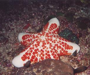 Op internet had ik al een artikel gelezen waarin gezegd werd dat de riffen rond de Seven Brother eilanden soms geel gekleurd waren van de vis, maar dit maakten we pas mee in de “Chinese tuin”. Hier zag je echt alleen maar gele vissen zo ver je keek. Je moest ze letterlijk wegjagen om andere rifbaarzen en langoestes te kunnen bekijken. Hier lag ook een flinke verpleegsterhaai te slapen en ik zag een krokodilvis en een paar schuwe Napoleons. | ![]() Zeester. |